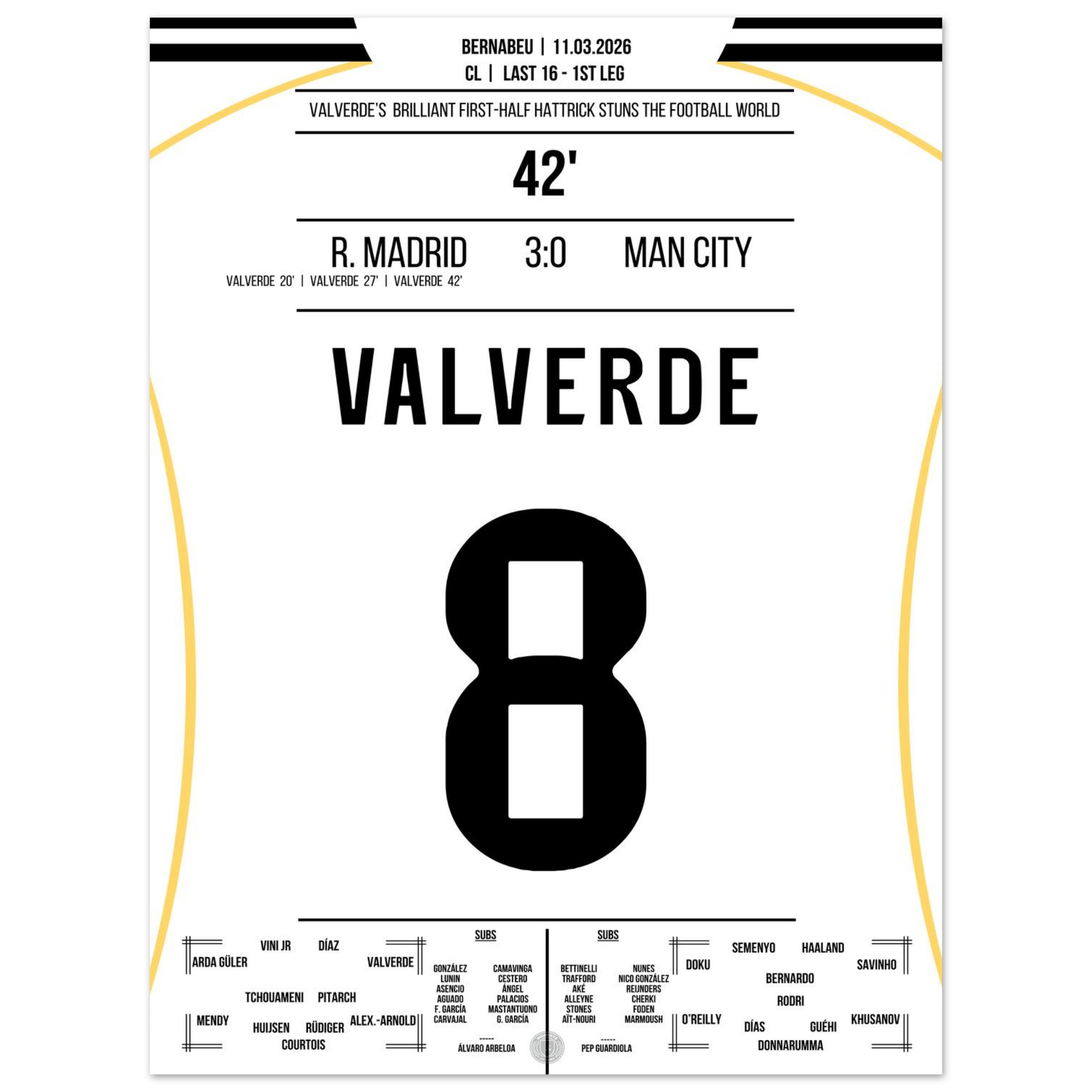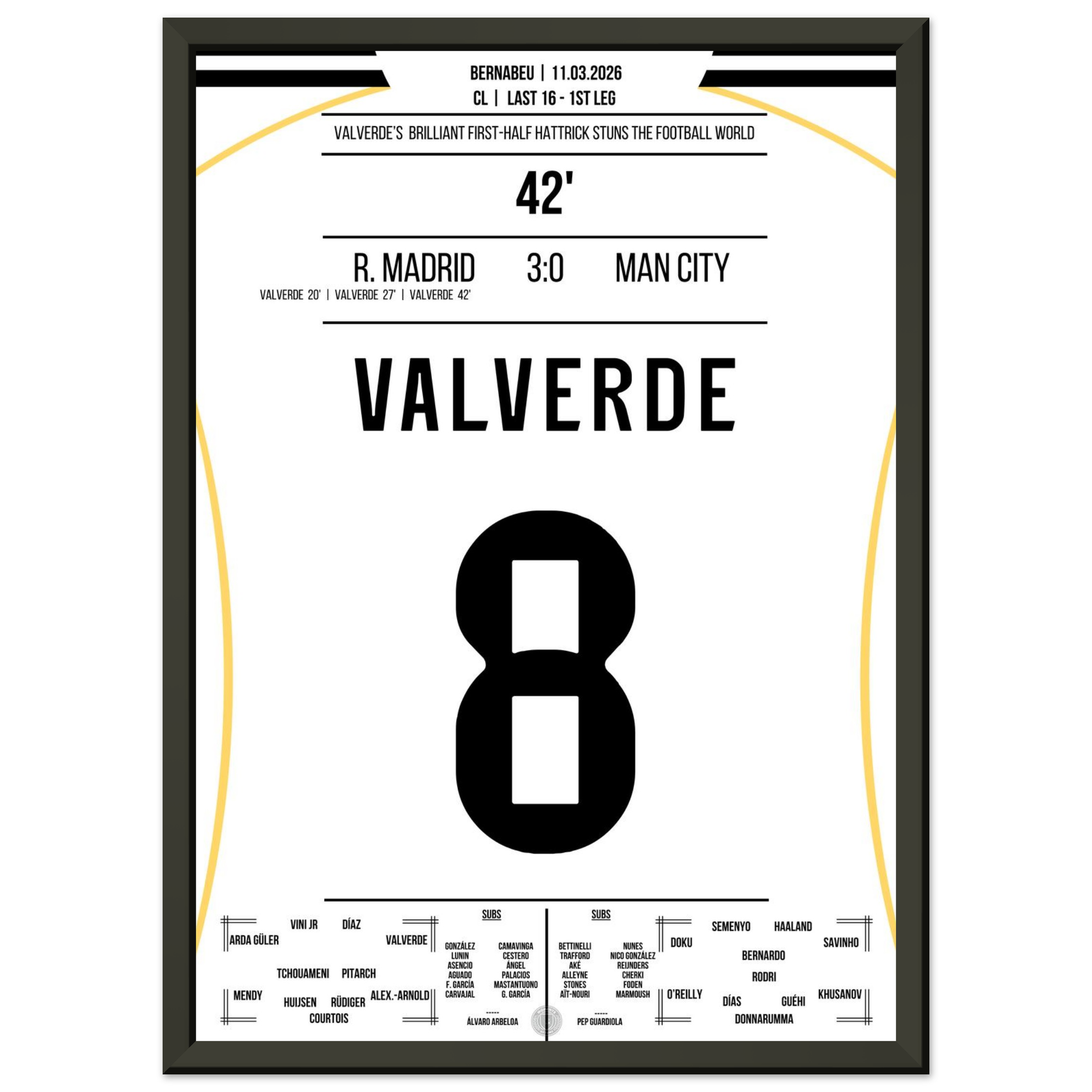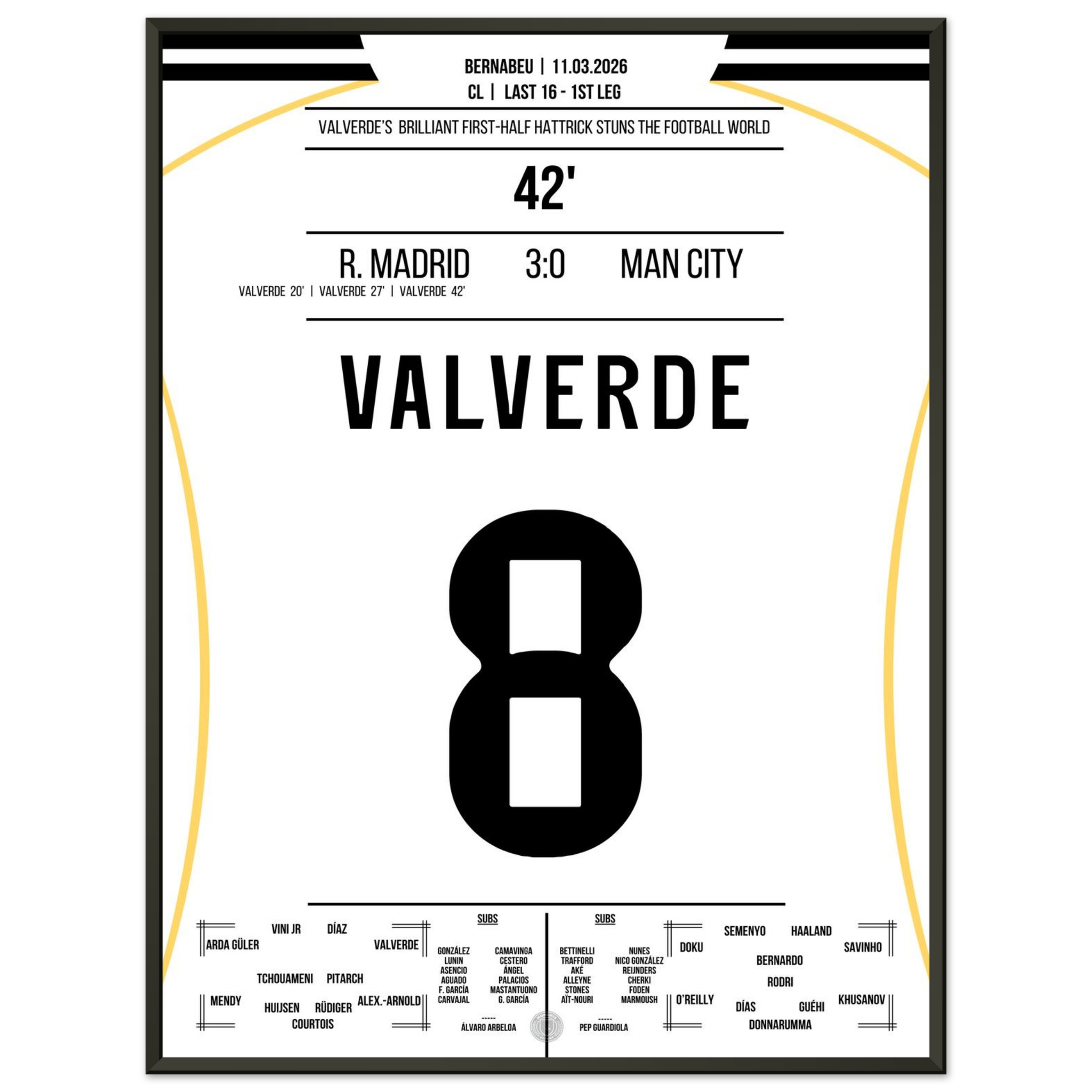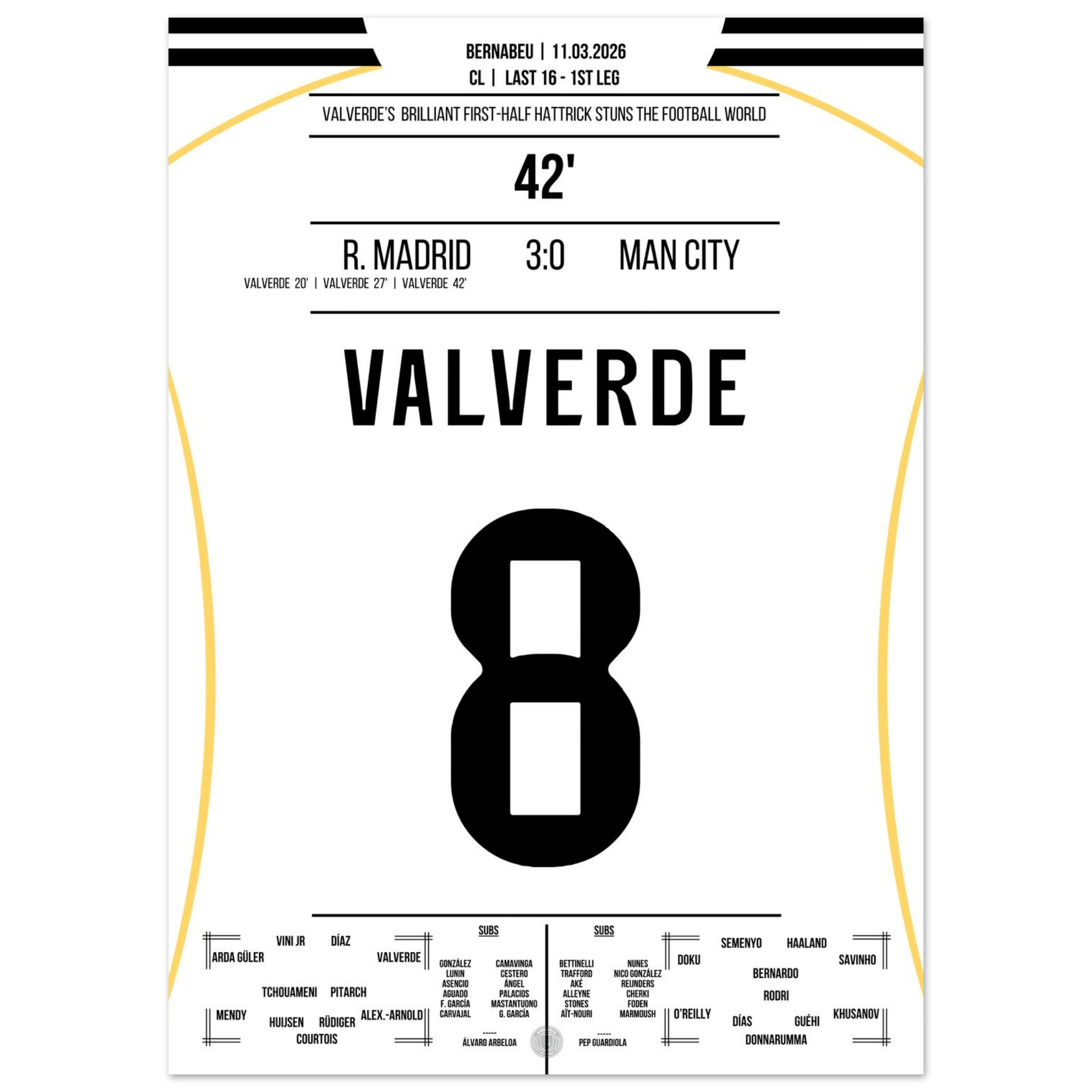 Dieses Poster hält den Moment fest, in dem Valverde mit seinem Hattrick das Bernabéu zum Beben brachte – eine Nacht für die Ewigkeit.